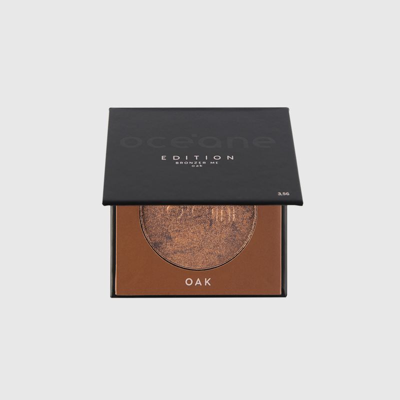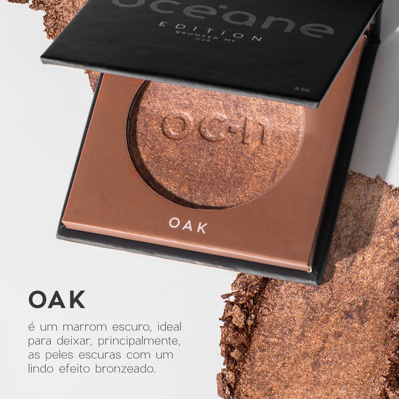 cor Oak é um marrom escuro, ideal para deixar, principalmente, as peles escuras com um lindo efeito bronzeado. O Bronzer Me Edition ainda conta com partículas de brilho que deixam o