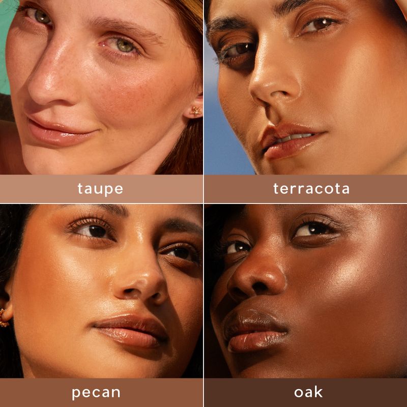 Além da cor Oak, temos mais 3 opções de cores que combinam com muitos tons de pele. E como o Bronzer Me também aceita a construção de camadas, você pode ajustar a intensidade do efeito bronzeado apenas adicionando mais ou menos produto na pele. O resultado fica impecável!