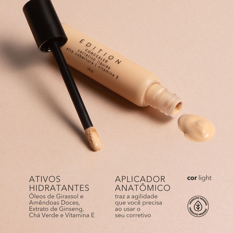 O corretivo líquido light possui uma durabilidade excepcional na pele, mantendo sua maquiagem intacta por mais tempo com uma pigmentação incrível. O Concealer é enriquecido com ingredientes como Chá Verde, Óleo de Girassol, Óleo de Amêndoa Doce, Vitamina E e Extrato de Ginseng. E, vale ressaltar, que sua fórmula é vegana, tornando-o ideal para pessoas que valorizam produtos que não testam em animais. A embalagem vem com um pincel anatômico, projetado para facilitar a aplicação, especialmente para aqueles que não têm muita experiência em aplicar corretivo no rosto.