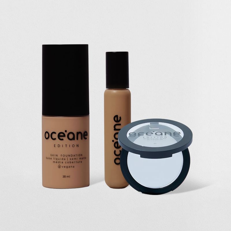 O Kit Base Líquida 300M + Corretivo Líquido Medium + Pó compacto Translúcido contém: