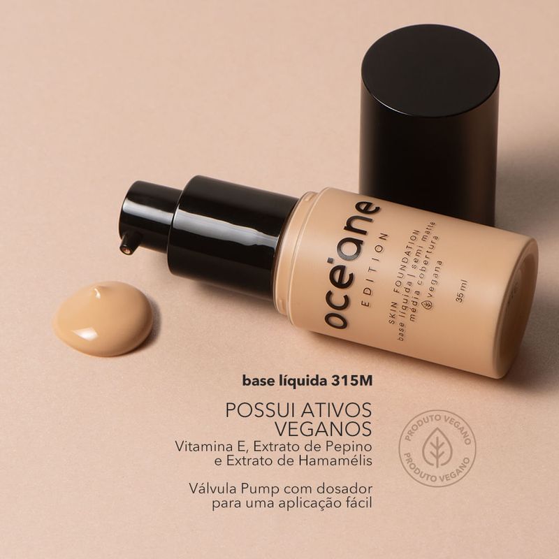 A base líquida cor 315M é uma tonalidade média que se adapta a várias cores de pele, sendo ideal para o rosto das brasileiras.Super confortável, ela não incomoda, corrige pequenas imperfeições do rosto e disfarça as linhas de expressão. Ah, e ela possui longa duração para sua comodidade e segurança. Se você quiser mudar a textura da base, basta usar um pó solto ou compacto para um efeito diferente. A base líquida possui fórmula vegana (sem ingredientes de origem animal em sua composição) e é enriquecida com Vitamina E, Hamamélis e Extrato de Pepino. A embalagem do produto é prática e versátil: possui uma válvula pump que evita desperdícios e contato com o produto.