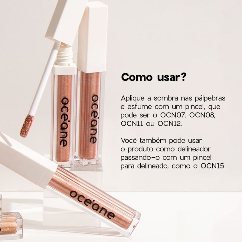 sombra líquida é super prática de usar e dá um toque radiante para qualquer produção. Você pode utilizá-la sozinha, para um brilho elegante no visual, ou combinando com outras cores. Faça como a sua criatividade mandar, afinal, Océane te apoia a expressar seu verdadeiro estilo.